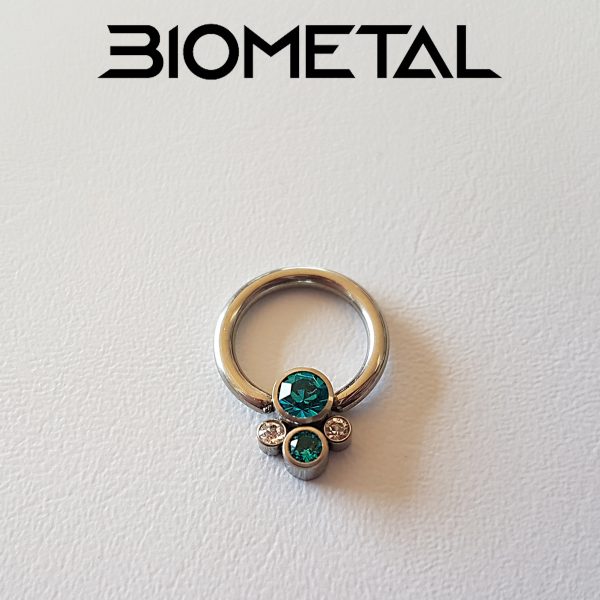 Argolla Captive de Titanio con Cluster de Zirconias marca BIOMETAL. Calibre 14Ga (1,6mm). Diámetro 9mm. Dimensión Cluster 7mm x 6mm. Si Quieres variar el Calibre y/o Diámetro de la Argolla, favor comunicarse con nosotros.
