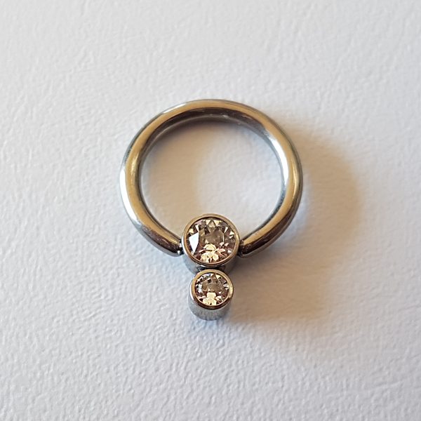 Argolla Captive de Titanio con Cluster de Zirconias. Calibre 14Ga (1,6mm). Diámetro 10mm. Tamaño Accesorio 7mm x 4mm. Si Quieres hacer un Cambio en el Calibre y/o Diámetro de la Argolla, Favor Contactarnos.