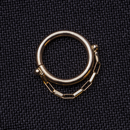Argolla Continua Seamless con Cadena. Oro Sólido 14Kt. marca NAMASTE (Fabricación Mexicana). Calibre 16Ga (1,2 mm). Diámetro 8mm. Esta argolla requiere ser torcidas para su instalación.