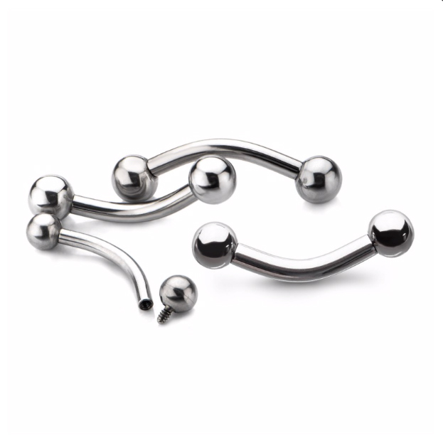Barbell Curvo de Titanio marca BIOMETAL. Disponibles en Calibre 16Ga (1,2mm) x 8mm y 10mm con Bolas de 3mm y Calibre 14Ga (1,6mm) x 8mm, 10mm y 12mm con Bolas de 4mm