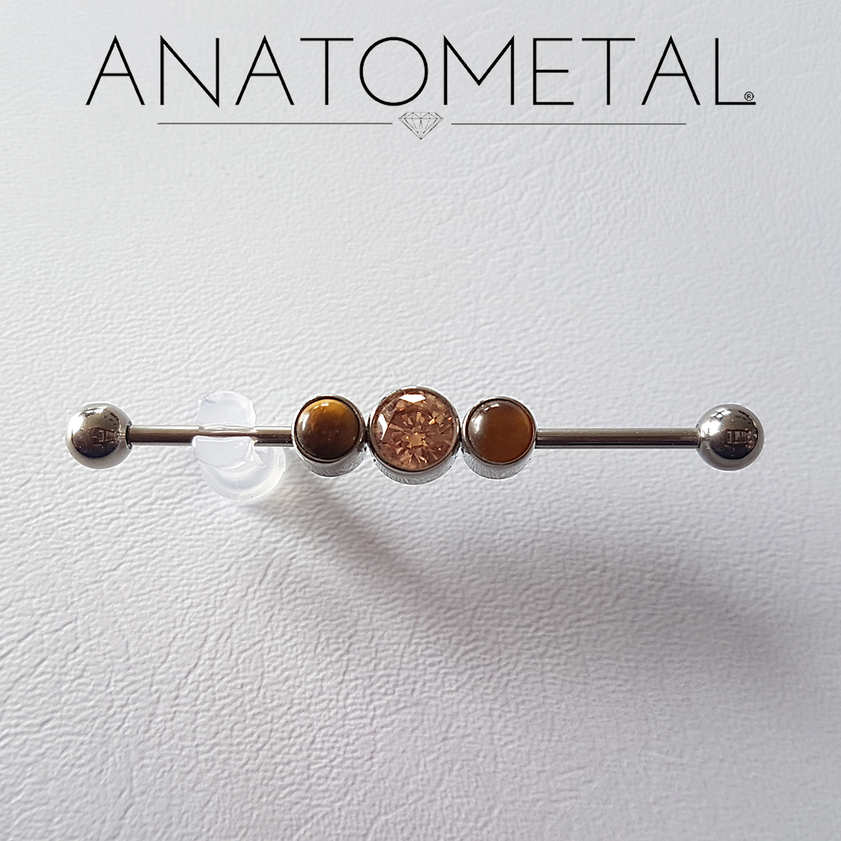 Barra para Industrial de Titanio Con Triple Accesorio de Zirconia Swarovski y Ojos de Tigre, marca ANATOMETAL. Calibre 16Ga (1,2mm), Diámetro 34mm. Bolas de 4mm. Si requieres un Diámetro menor o mayor, favor contactarnos.