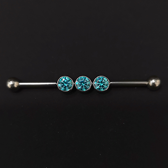 Barra para Industrial de Titanio Con Triple Zirconia Swarovski Turquesa al centro, marca INDUSTRIAL STRENGTH. Calibre 14Ga (1,6mm), Diámetro 35mm. Bolas de 4mm. Si requieres un Diámetro menor o mayor, favor contactarnos.