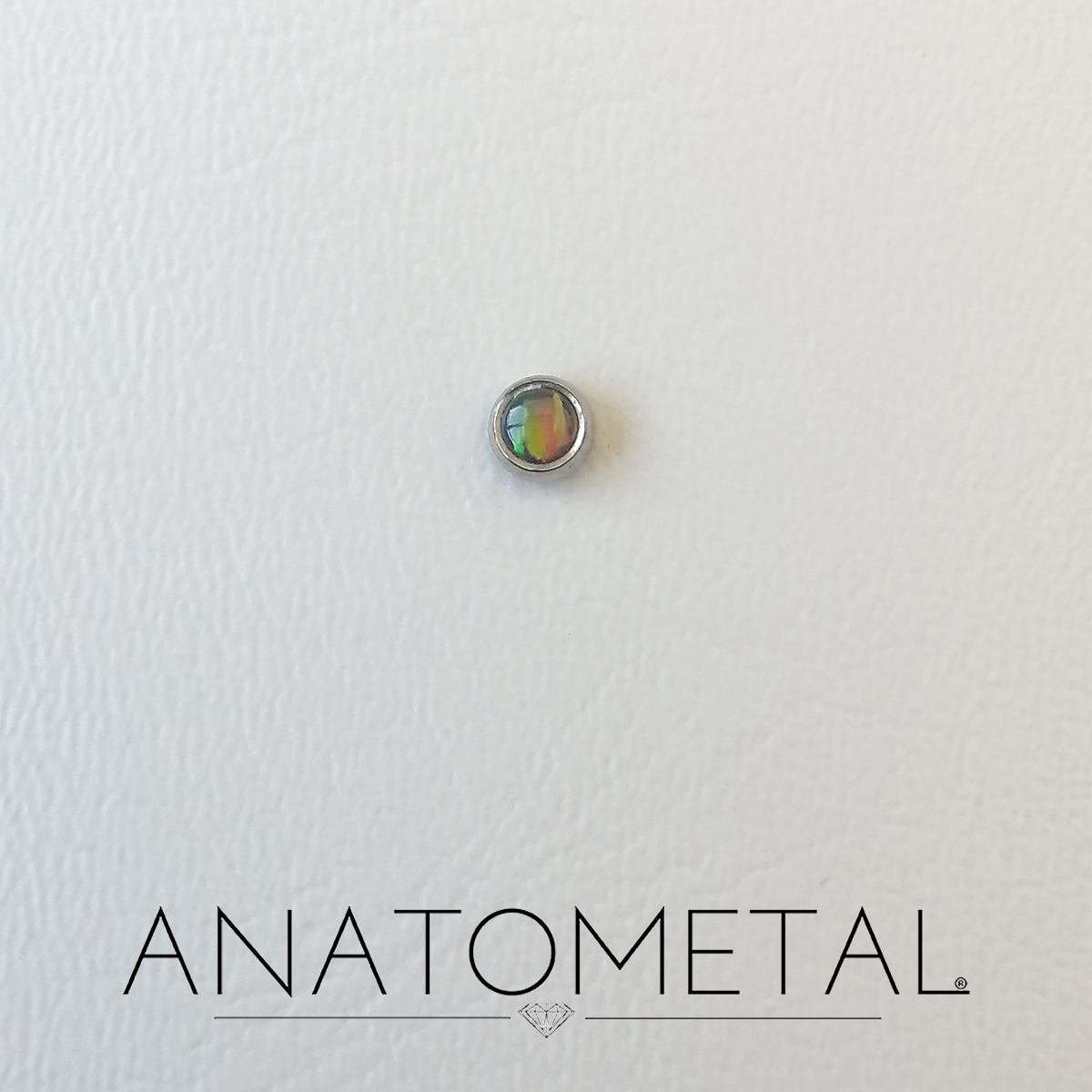 Opalo Bezel Set montado sobre Titanio marca ANATOMETAL. Calibre 16Ga (1,2mm). Diámetro 3mm. No Incluye Barra. Puedes Comprar la Barra Aquí!
