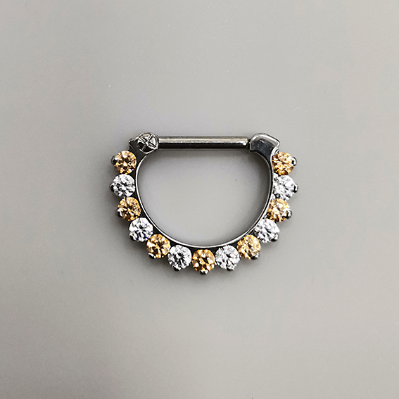 Clicker de Titanio INDUSTRIAL STRENGTH. Ideal para Septum y Daith. 13 Zirconias Swarovski Blancas y Champagne. Calibre 16Ga (1,2mm). Diametros 10,5mm x 9mm