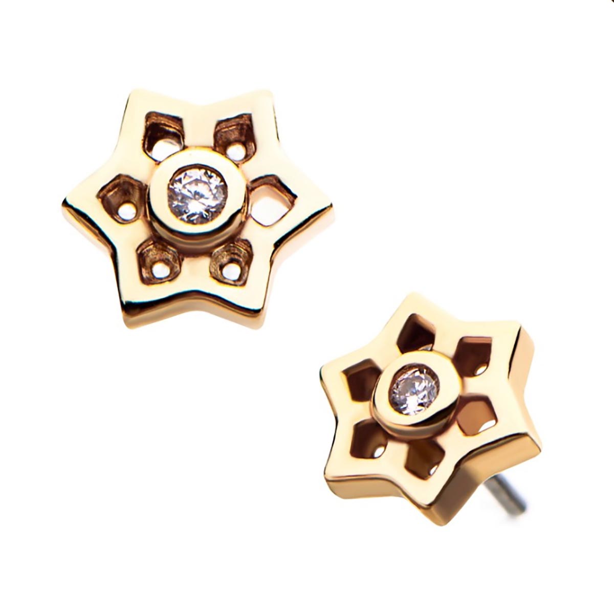 Estrella Mandala con Zirconia Blanca en Oro Sólido de 14Kt. Diámetro Estrella: 5mm, Zirconia: 1mm. Joyería Push Pin (Sin Rosca). No Incluye Barra. Puedes Comprar la Barra Aquí!