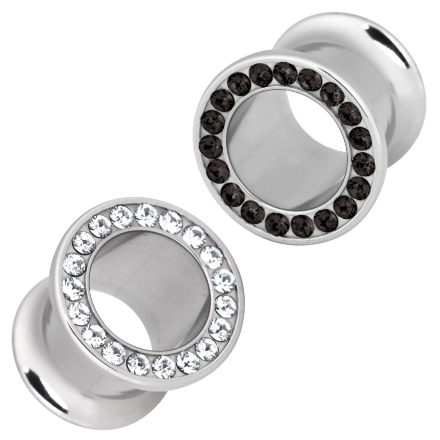 Expansores Eyelet Double Flared de Acero Quirúrgico con Cristales Rhinestones. Disponibles en Color Blanco y Negro. Incluye 2 Unidades. Calibres: