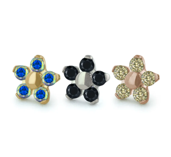 Flor en Oro Sólido de 18Kt. con Zirconias Swarovski, marca NEOMETAL. Joyería Push Pin (Sin Rosca). No Incluye Barra. Puedes Comprar la Barra Aquí!. Incluye 1 Unidad.
