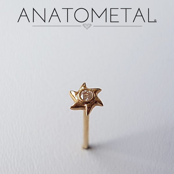 Gem Star Nostril Screw de Oro Sólido 18Kt con Zirconia Swarovski, marca ANATOMETAL. Calibre 18Ga (1mm). Diámetro Estrella 5mm. Zirconia 2,5mm. Nota: La joyería se entrega con la barra doblada.