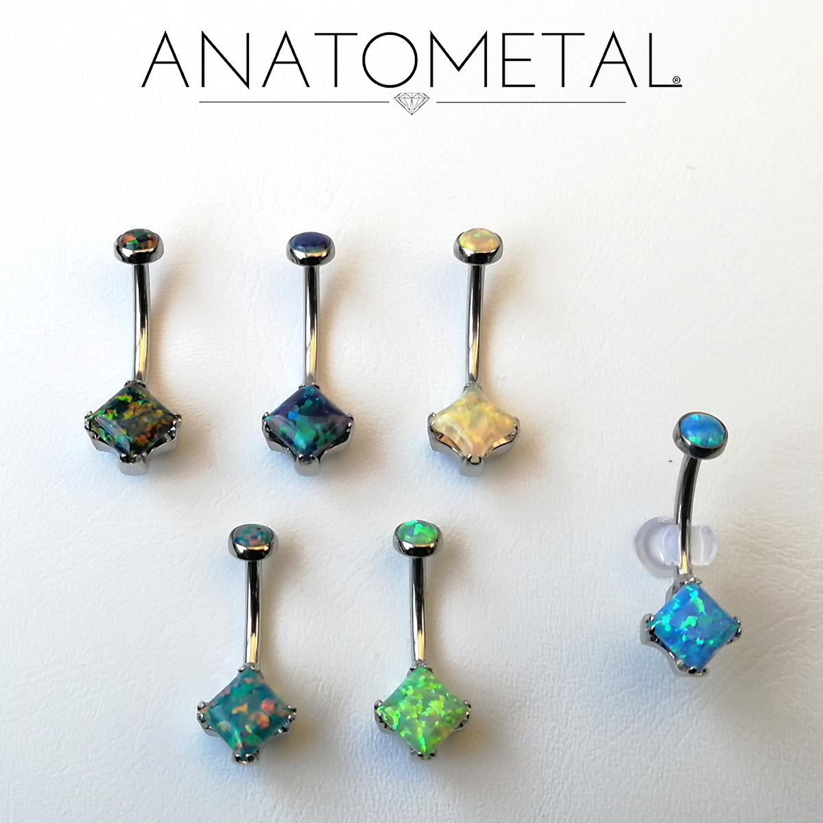 Joyería de Ombligo, Barbell Curvo de Acero Quirúrgico con Opalos. Marca ANATOMETAL. Calibre 14Ga (1,6mm). Accesorio Superior 5mm, Inferior 9mm. Diámetros y Colores a Elección.