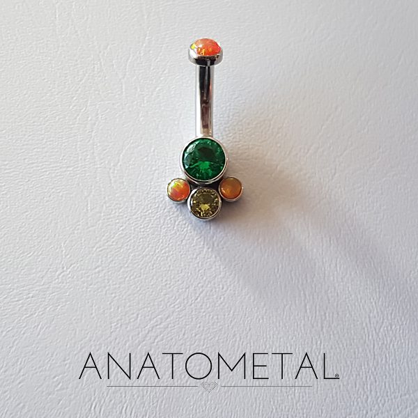 Joyería de Ombligo, Barbell Curvo Big Gauge de Titanio con Zirconias Swarovski y Opalos. Marca ANATOMETAL. Calibre 10Ga (2,4mm). Diámetro 10mm. Zirconia Superior 5mm, Inferior 10mm x 11mm.