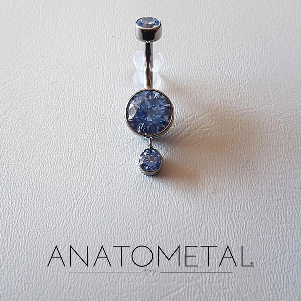 Joyería de Ombligo con Colgante, Barbell Curvo de Titanio con Zirconias Swarovski. Marca ANATOMETAL. Calibre 14Ga (1,6mm). Diámetro 9mm. Accesorio Superior 5mm, Inferiores 9mm y 5mm.