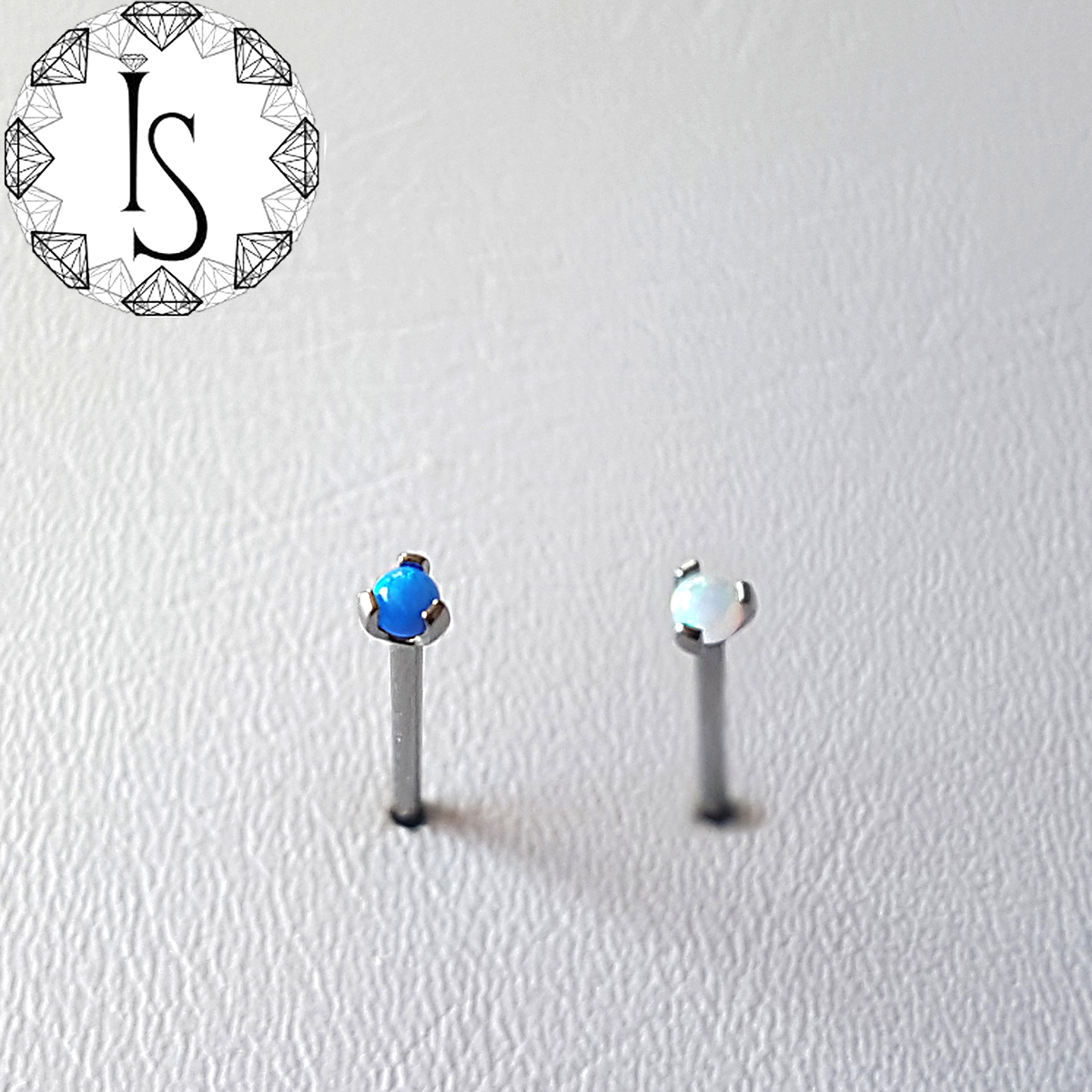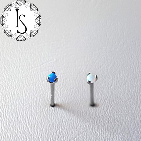 Nostril Screw marca INDUSTRIAL STRENGTH. Titanio y Opalo Prong Set. Calibre 18Ga (1mm). Diámetro Opalo 2,5 mm. Se entrega con la barra doblada. Disponible en Azul y Blanco