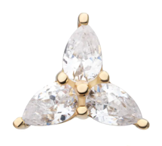 Trinity Zirconias en Oro Sólido de 14Kt. Dimensiones 6,5mm x 5,7mm. Joyería Push Pin (Sin Rosca). No Incluye Barra. Puedes Comprar la Barra Aquí!. Incluye 1 Unidad.